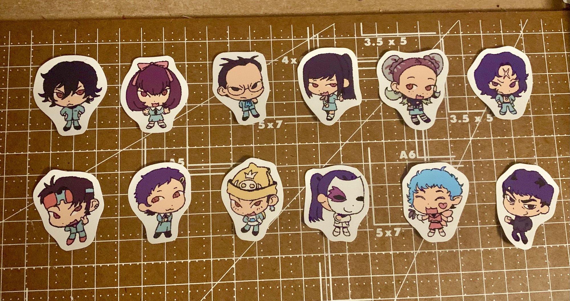 Hand printed and cut on glossy sticker paper. About 1 inch tall