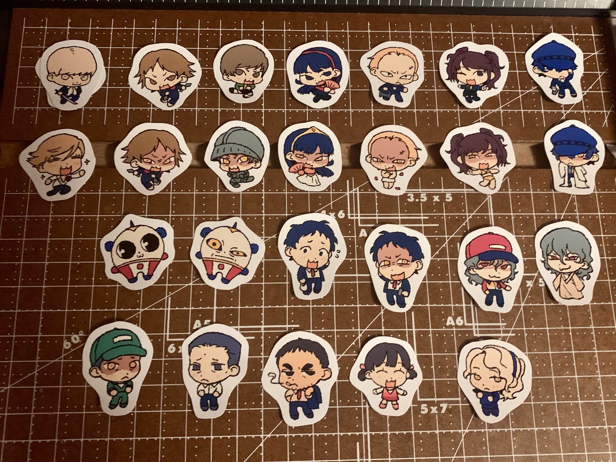 Hand printed and cut on glossy sticker paper. About 1 inch tall. All investigation team members + adachi + namatame + izanami options come with two stickers of the two designs, example: selecting Yosuke means you are buying both designs, that's why they are $1.50 and not the usual $1. Selecting Teddie gives you three designs. Dojima family includes Yu, Nanako, and Dojima.